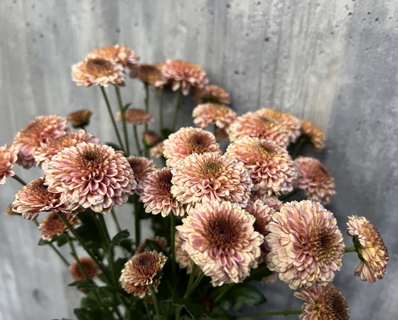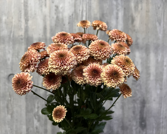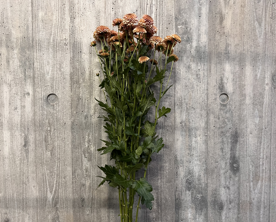 ポンポン咲きのまるっとしたフォルムが可愛らしい菊です!花色もくすみがかったサーモン色をしており、少しシックで大人な雰囲気を放っています。
