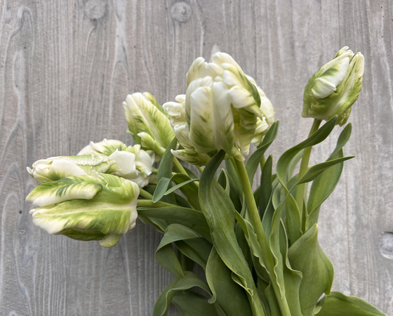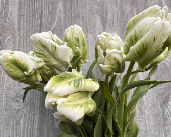 少し縮れた白い花弁に緑色の模様が入った少し変わったチューリップです。ボリュームもインパクトも抜群です!